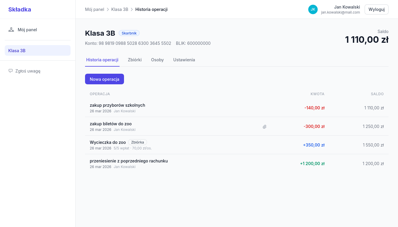 Zarządzaj składkami w grupie — szkolnej, sportowej czy znajomych. Przejrzyste saldo, automatyczne przypomnienia i pełna kontrola nad finansami.